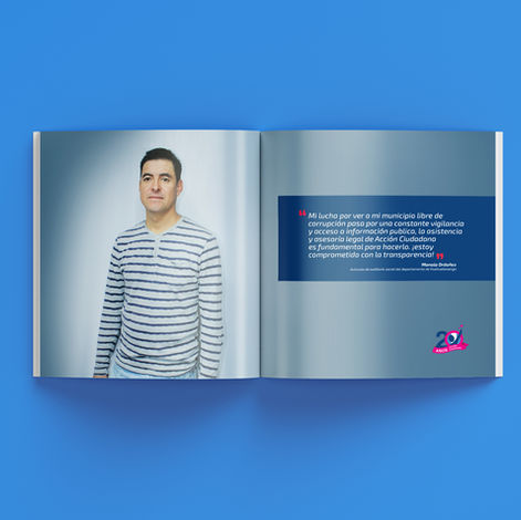 Con motivo de la celebración de su 20 aniversario, Acción Ciudadana decidió documentar con una publicación especial sus 20 años de trabajo fomentando una cultura de transparencia, libre de corrupción. En conjunto con el equipo de Acción Ciudadana desarrollamos el contenido y el diseño de forma paralela, nuestro principal reto fue lograr que la publicación estuviera lista para ser presentada en la Gala de Honor a personajes muy importantes que han sido clave para la lucha contra la corrupción en Guatemala. Una de las partes más interesantes fue introducir una Cronografía a la mitad del libro en forma de inserto, para que al llegar a la mitad se pudiera desplegar en forma de pliegue de 2 puertas y revelar una la línea de tiempo con los hitos más importantes de la organización. Así también la integración de imágenes que durante 20 años los medios de comunicación han publicado con importantes noticias de las que Acción ciudadana fue un protagonista para dar vida a la portada de la publicación.